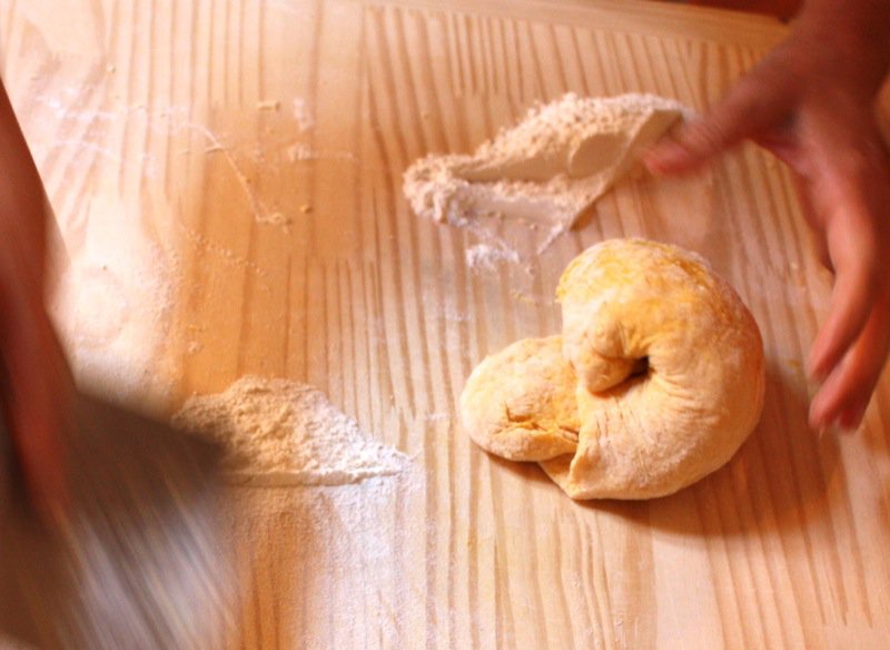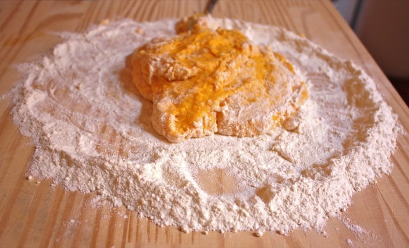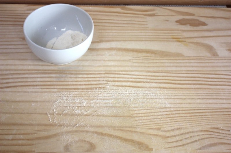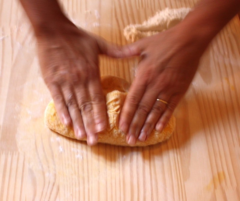Use the spatula to release the dough from the board; it has a tendency to stick, and is very delicate at this point. Be gentle. Slowly, slowly: there is no rush.