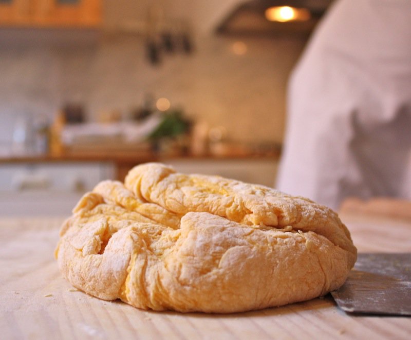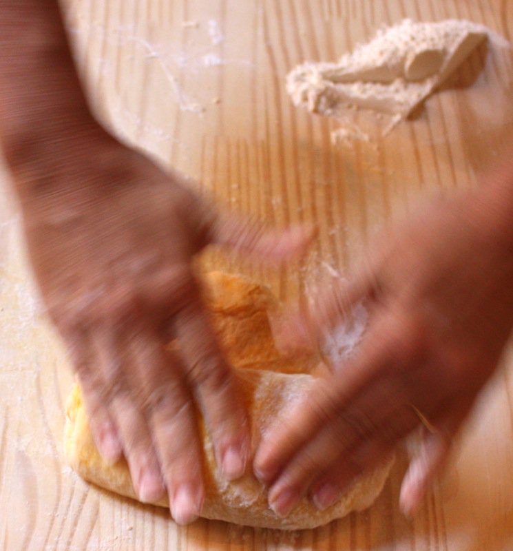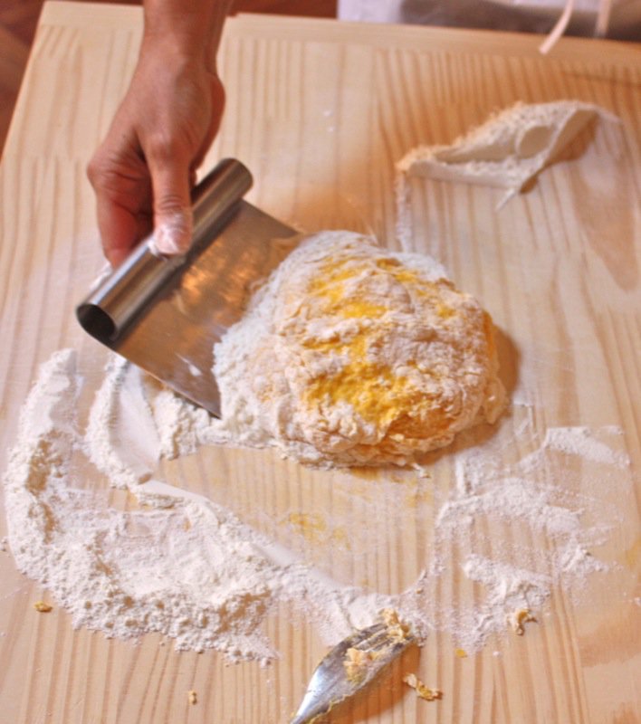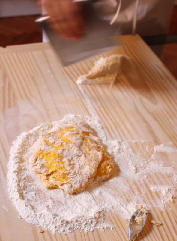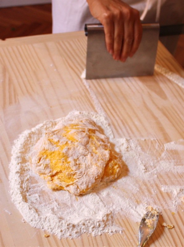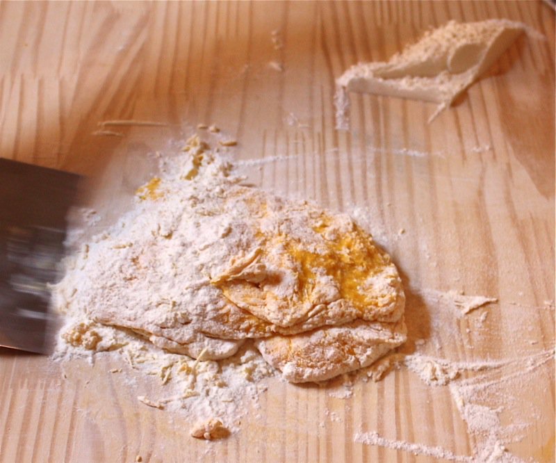 When almost all of the flour is incorporated, you need to start using the spatula. Move the “good” flour to the side; scoop up the pasta and set it aside, then clean the sticky “gunk” from the pasta board and place it to the side. You do not want these dry or hard bits worked into the beautiful tender dough. Then, start incorporating the good flour, using the spatula, as you see below, through a folding knead, just until the pasta is dough is no longer sticky. There may be some “good” flour left over. Remember that the only variable in the measurement of these two ingredients is the size of the eggs. This is the time you compensate for that through this process. Remember, there is no rush. Maribel was clear about that: slowly, slowly…. slowly.