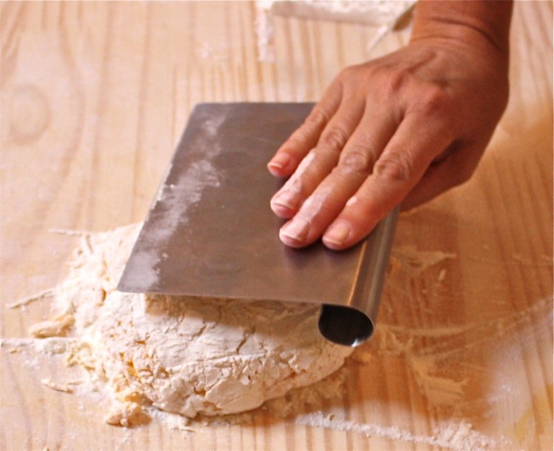 These techniques are her own, and personally, I find them brilliant! She carefully went over each one before actually demonstrating it on the dough. The thirty minutes were up just as she finished scraping the board to clean it of any dry bits. Consistently, dust with only a whisper of flour as needed before laying the dough on the surface after each ¼ turn.