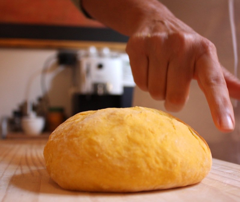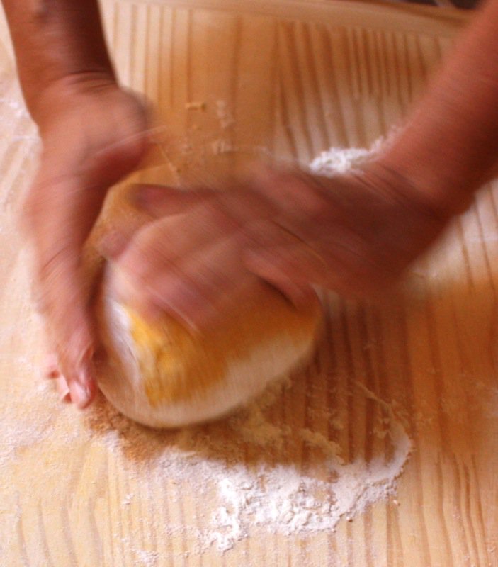Add only enough flour to have the mixture feel like a soft play dough. Dust with a wisp of flour under the board and on the ball: flatten and fold gently to the middle. Do not press hard or you may tear the gluten threads; fold, push gently, ¼ turn, fold, push gently, ¼ turn etc…