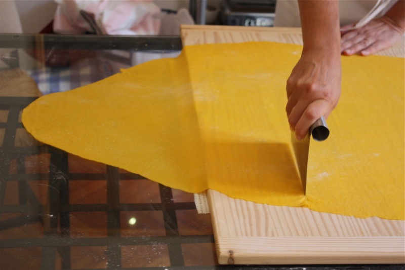 When the dough is thin enough to read through, or as the Bolognese say, “The pasta is thin enough when it is held in the window and one can see San Luca Basilica through it.”, it is time to work on the edges.