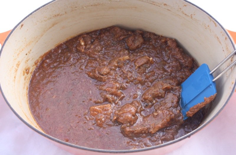 Chunks of meat are added into the mix and all is once again covered with water and simmered. This is the point where simmering for a long time is really important when you have a tough cut of meat. You can see my pan is now too full, and I need to transfer the goods to a larger pot for this part of the process.