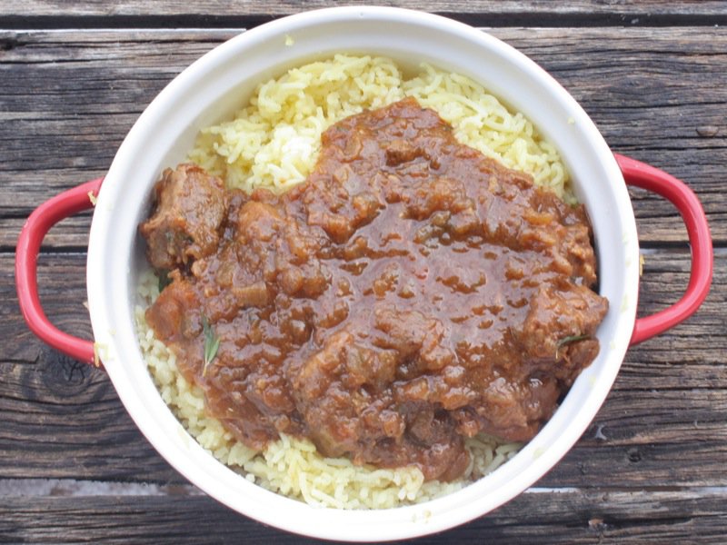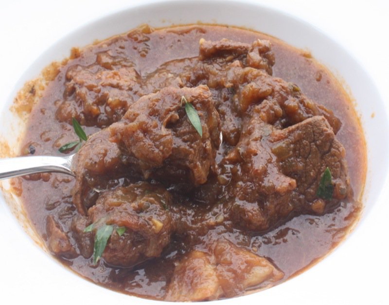 Delicious! I used about 7 medium onions to 650grams of gravy beef. My dd was horrified at the amount of onions I was caramalising as she dislikes onions. At the end the onions were just beautifully incorporated into the dish, almost melted away. Although I was apprehensive, I really liked the pureed tomato added to it- made it really special.