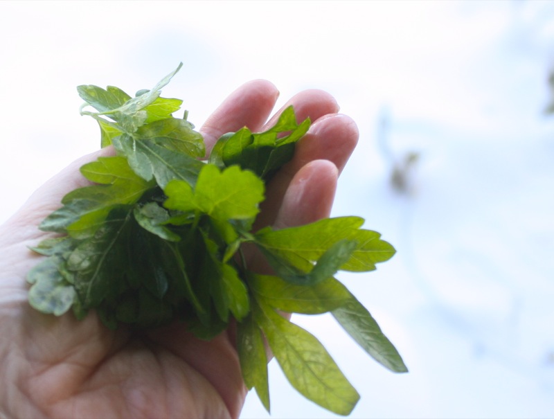 Parsley? Darn! And I know the difference a little of this makes to developing a complex flavour! So, knowing where the snow fell over it, out I scampered to retrieve enough for this dish! I found a branch and pulled it out from under the snow! Brrrr! The leaves were still lush and beautiful under those freezing white crystals!