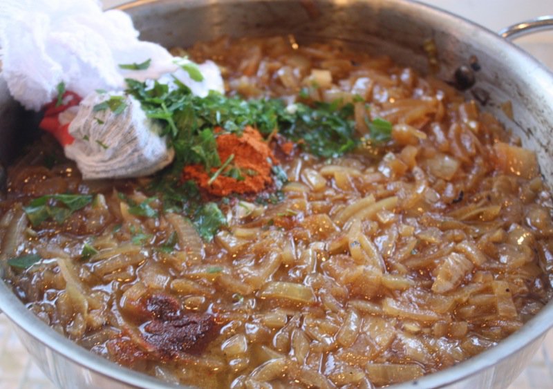 The simplicity of adding water to cover the onions just makes sense. Above, I have put both batches of onions into the pan and covered them with water to simmer. Why a double batch? I know my husband. This recipe says it serves four. That means two at our house. Remember, these people love their meat! After the onions have simmered, the parsley, paprika and bay leaves are added into the mix, with salt and pepper to taste. The bouquet garni has the bay leaves in it to save me from searching for them later. (Keep in mind you are seeing a double batch of ingredients in these photos. ) This is a land of paprika, or red peppers. The peppers grown in these Eastern countries are the best in the world. Ajvar is a famous dish in the homes of Balkan people. There is still not a commercial company who makes it anywhere close to to the people in their homes. Dried paprika is so fragrant and fresh that the paper bag I buy it in is wet from the oils in the peppers by the time I get home. You must use a really good paprika for this dish. Serbian paprika for Serbian Goulash! 🙂