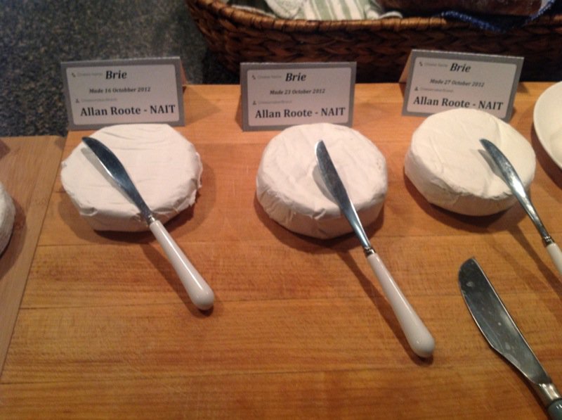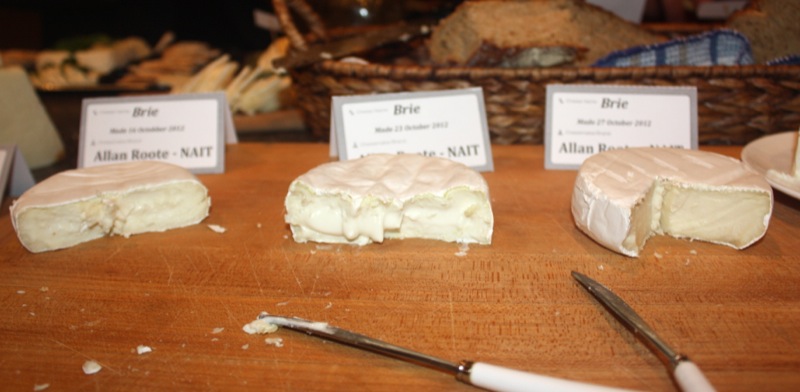 From left to right, above and below: 16th October 2012, 23rd October 2012, and 27th of October 2012. The textural and flavour changes within each Brie were considerable. The Tasting was on November 26th, so the youngest cheese was a month old, far right. The oldest brie was 11 days older than that, far left. I was actually surprised that the oldest cheese was not the gooiest. None of them had any ammonia flavour that is often associated with an aged brie. The texture of the middle one was divine, but the flavour of the older one was most complex, yet still buttery and lush. There were actually two of each round given to us, so we had a lot of fun with draws at the end of the evening and three luck tasters each took home a round of NAIT’s incredible Brie. Cheesepalooza will be making Brie sometime in the Spring and it is still unfathomable for me to imagine being able to make a cheese like this! Yes, what did I just do? Caerphilly and Farmhouse Cheddar! Oh, my! One would think by now I would know I can do anything. (We have all had enough failures to temper that thought!) Take a closer look at the bries, in the same order, left to right below. Looking is all you can do unless you come to a Tasting! 🙂