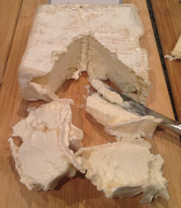 Addie also brought his very old Cabécou: the one we made in September together, to see what the shelf life was like, as Mary’s recipe recommended that it be eaten within three weeks. We all found it delicious and did have my new little Cabécou to compare it to. There was a difference, but both we delicious. You can also catch a glimpse of Addie’s homemade bread in the basket behind. Can he make a mean loaf of bread!