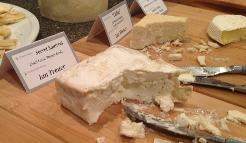 Because Ian was taking the photos and mine turned out as they have, some of his contributions were too blurry to include. Below is his Secret Squirrel, which was completely unforgettable: gorgeous soft creamy and gooey at times delectable tangy cheese that bites you back, but in a really tingly, exciting way. Ian is now into semi-lactic cheeses and this one was a triumphant celebration of his tender efforts. Beside it, is Chloe. This is a cheddar that he made in honour of his daughter a couple of months before she was born, named it after her, and plans to share it with his family when she turns one in two weeks. We got a very lucky first taste. I was in absolute awe. This cheese was aged only one year and held the depth and breadth of a wizened round of the finest Parmesan Reggiano. The flavour was different, but the tasting was as profound, for me. The other is a Smoky Valley Goat Brie that Ian took home and aged. Loverly! I am missing his first cheese, to the left of the Secret Squirrel, but I am going to take you on a few moments of Secret Squirrel glory through the following images.