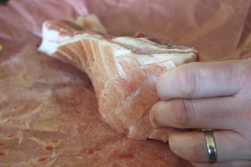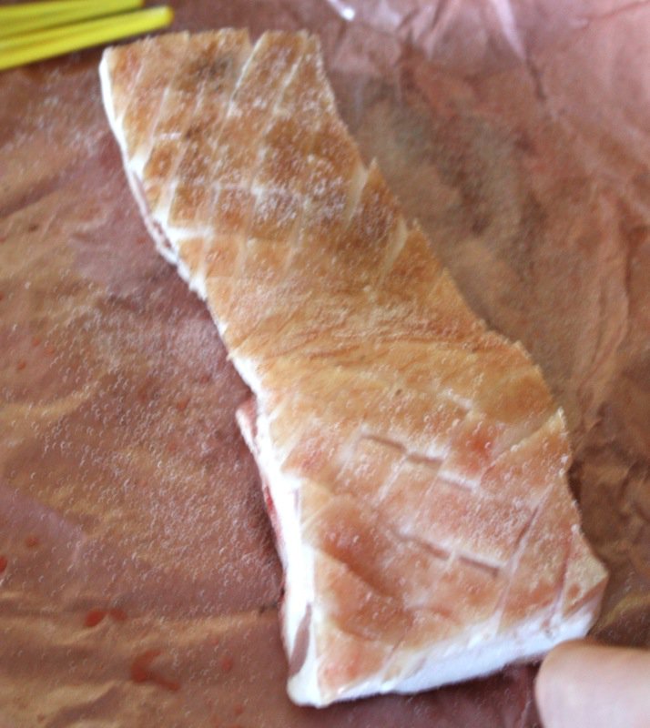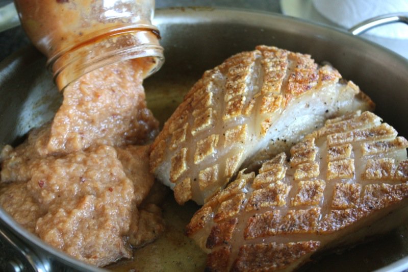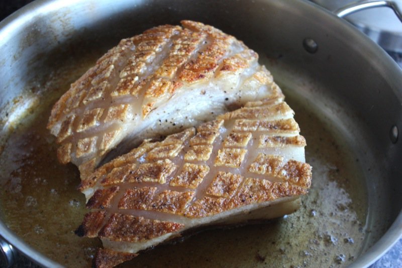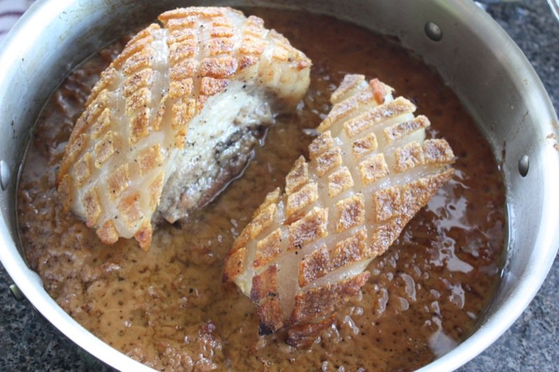 The rind was so tough, even my best knives (and we both have great knives) wouldn’ t cut into it. Out came the lame I use for scoring my bread dough. He needed two to finish the scoring! Gorgeous, isn’t it? We only had the afternoon, so we had no time to sous vide the belly, or anything so technical. His thought: brown the skin and then finish it in the oven.