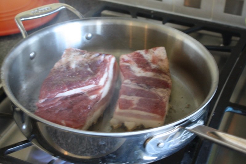 Corey came over to teach me some of his insights for my website and blog posts as well as to cook with me. We had a blast cooking a great meal, but never got to the technology. Cooking together will do that. It is just so much fun! He wanted to make some pork belly for part of the meal. I happen to have a half a Tamworth Pig in my freezer, so out came some pork belly. Hmmm… he forgot his recipe. No matter.