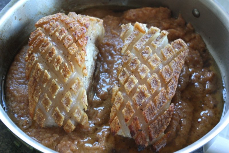 - Add applesauce, using tongs to ensure sauce is under pork belly