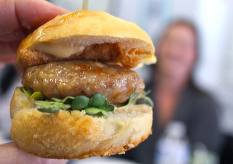 The chefs at Sage presented a confetti of crunchy julienned vegetables over their “pork three ways”: crispy, pulled and belly. None of us could locate the crispy pork, but the bite was mighty tasty. The vegetables were completely overpowered by the meat. Their crunch joined the choir, but there wasn’t even a whisper of veggie flavour in the bite. We were all wondering if the placement of this entry was just too far down the line to appreciate. It was seventh and we were sliding down the all too slippery slider slope of over saturation at this point. Possibly verging on slider coma.