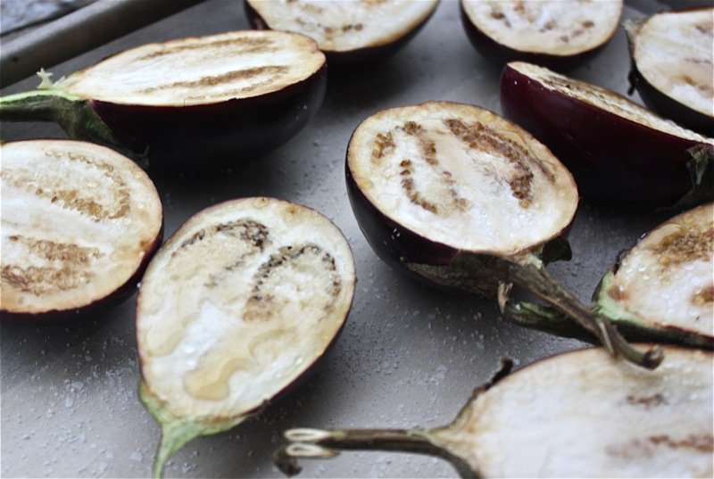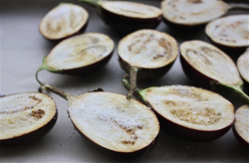 - 6 small Indian eggplant (normally just a few inches long, shaped like an egg), halved
