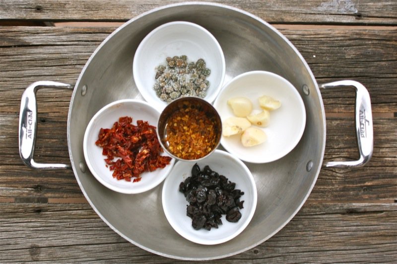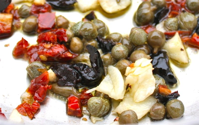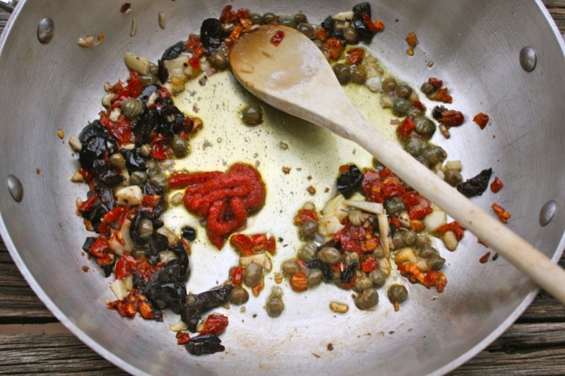 Letizia used the ingredients I am using. Just a little goes a long way: beautiful salt-packed capers, sundried tomatoes, garlic, black dried olives, red pepper flakes and gorgeous creamy toasted pinenuts (to be added later). These are fried quickly in a bit of fruity Umbrian olive oil, then a bit of tomato paste is added to the mix.