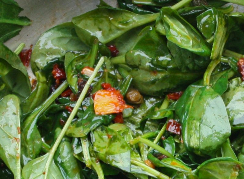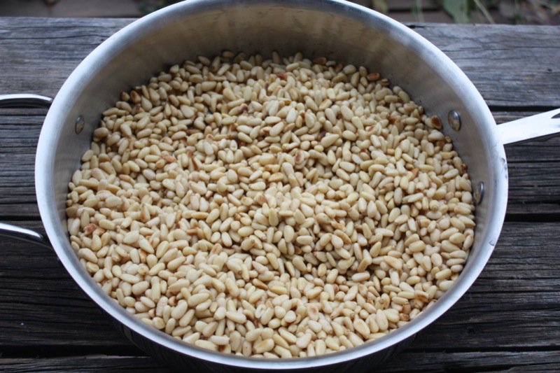 I adore the tender leaves of vitamin and mineral rich spinach. I piled the steaming pot high with the leaves as Letizia did with the kale, stirring just a couple of minutes to wilt them. Once wilted, the pinenuts are tossed into the mix, and, voilà – rather velato! The vegetable mixture c’est fini – è tutto finito!