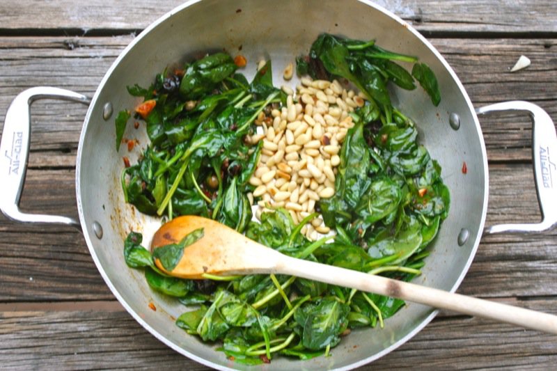 - Add spinach, and stir to wilt; toss in the pinenuts and stir