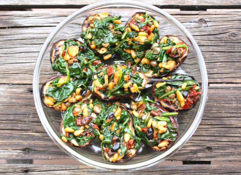 - Top each eggplant half with one twelfth of the vegetable mixture in an oven proof baking dish