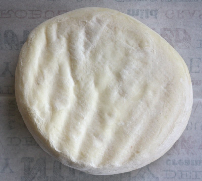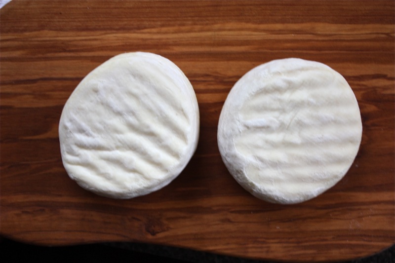 I kept them in the crottin moulds in the cave inside an aging box for over a week, and they just keep weeping. Why? I did unmould the knitted curd discs and place each on a mat, and within 2 hours they had spread to a frighteningly wide circular mass. I guided each mass back into a mould and continued to turn each regularly (two to three times a day) for the next week. Finally, I took each out of the mould in the ripening box, placed on a mat and below is the shape each formed. I continued to turn each daily. You can see the beginning of the white mold growing on the rind, as well.