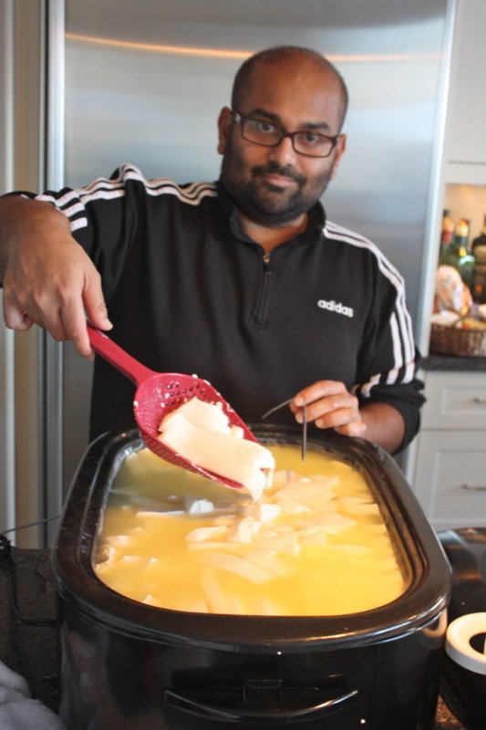 May I introduce you to Adyta Raghaven, our resident Cheesepalooza Dr. of Physics (true) and my kitchen partner in most of my cheese making adventures. He has kindly accepted my invitation to write about his experience with washed rind cheeses as he has experimented with this for quite some time now. I have not been able to make a washed rind cheese, yet, due to the intensity of my schedule these past few months. I am very grateful that Addie has agreed to share his vast, and I do mean vast, expertise on this subject. Most readers from Edmonton will know that Addie has a love of beer. All beers. All colours. All shapes. All sizes. He doesn’t drink to excess, but to access, and he definitely knows his beer. I have tasted an earlier washed rind cheese Addie had scented with beer, and enjoyed it. I detest beer. I have never had even a sip. The aroma is that off putting to me. Odd duck. But, that cheese was complex and compelling. So, drum roll, please: take it away, Addie! (Photo below is a photo of Addie making a different cheese.)