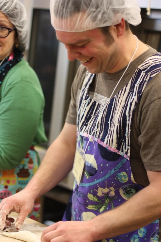 Pyrogies are a part of Northern Alberta’s cultural heritage. Chef David Omar from Zinc came prepared with much more than we were ready for, but our volunteers seemlessly moved in and helped out. Joveena, below, one of our dearly loved Senior Volunteers, with Little Miss Andrea et el, still grinning after peeling, boiling and ricing about 10 kilograms of potatoes for the filling. Participants were full of good will, teasing one another shamelessly, as they worked to hone their pyrogy making technique.