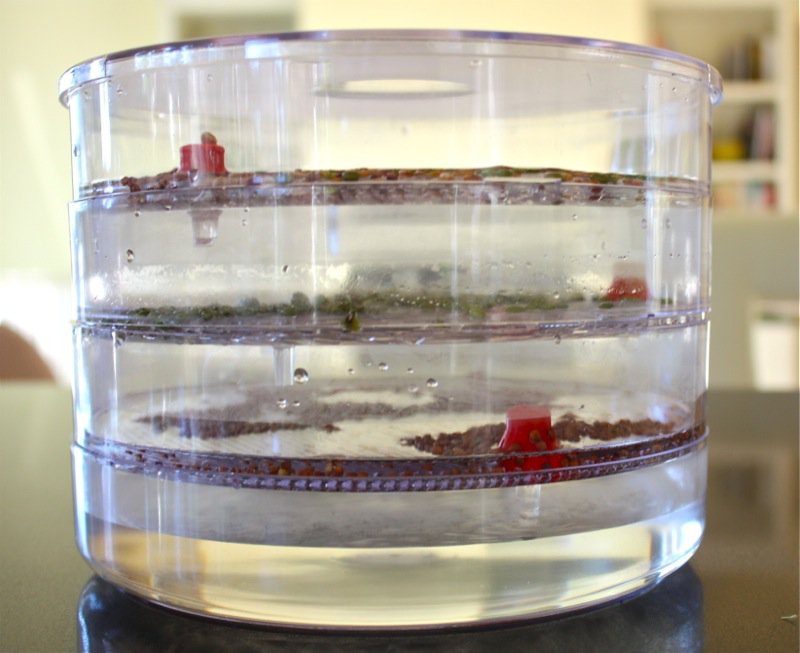 Received it last Friday. Cleaned it and filled the three trays up on Monday: a different variety of seeds on each tray (rinsed first): radish, above; mung bean, below.
