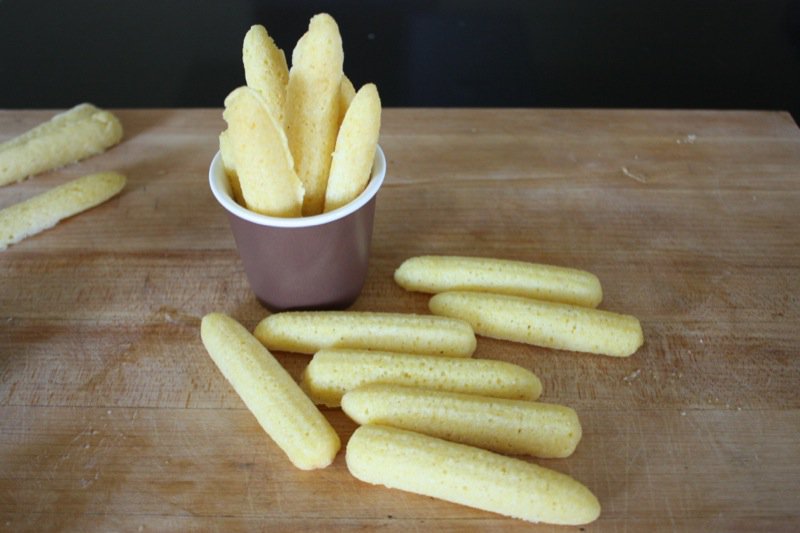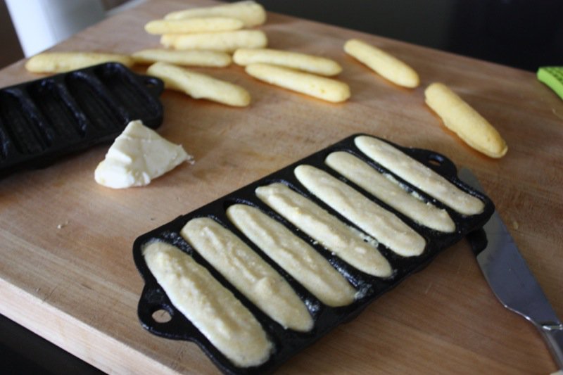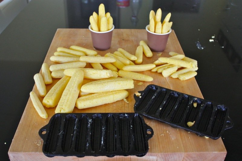 The trick is the 450°F oven and heating the rod iron pans in it before filling them with the batter. They are half cooked before they get back into the oven. I made large ones, too, and they are to be brown and crispy on the outside and tender on the inside. I was afraid to let the little ones get brown on the outside as there was only a teaspoon of batter per cob. However, they would probably be delicious as crunchy cracker type sticks, too.