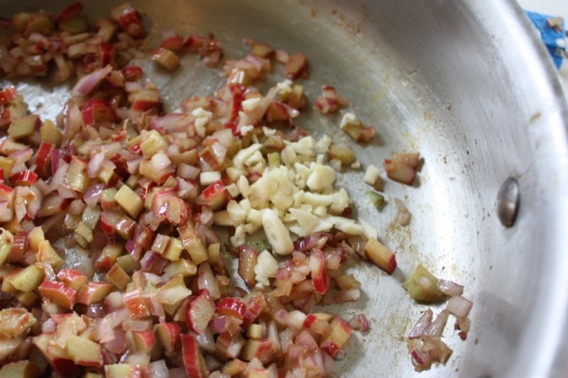 - Drain fat, if you have too much; add rhubarb and onions to bacon fat and sauté until onions are translucent and rhubarb begins to soften (no more than 5 minutes)