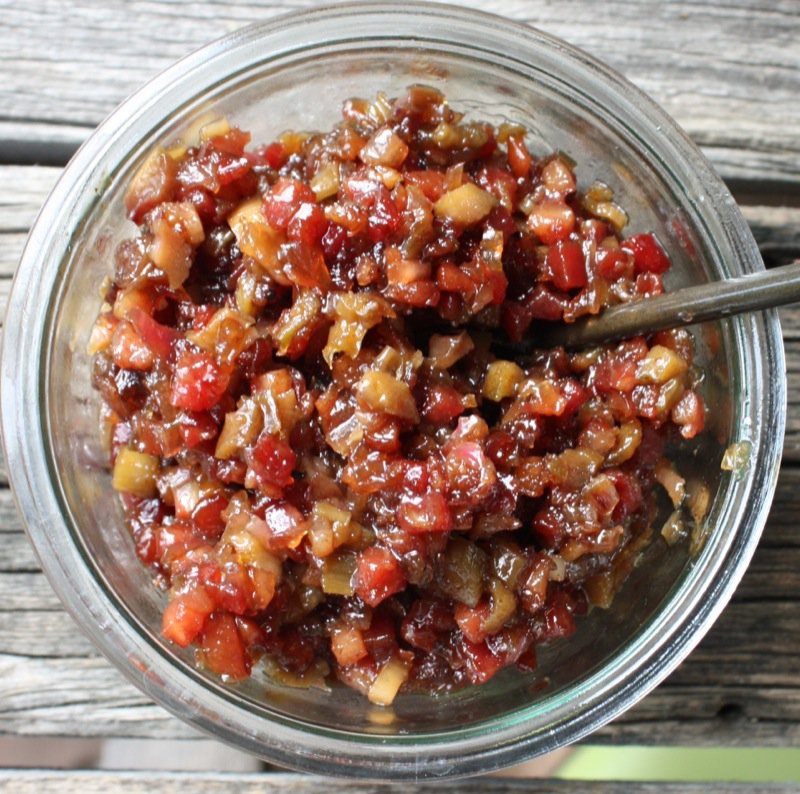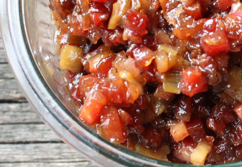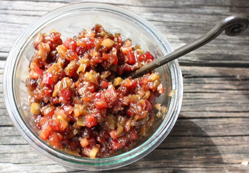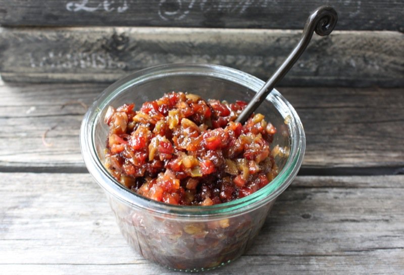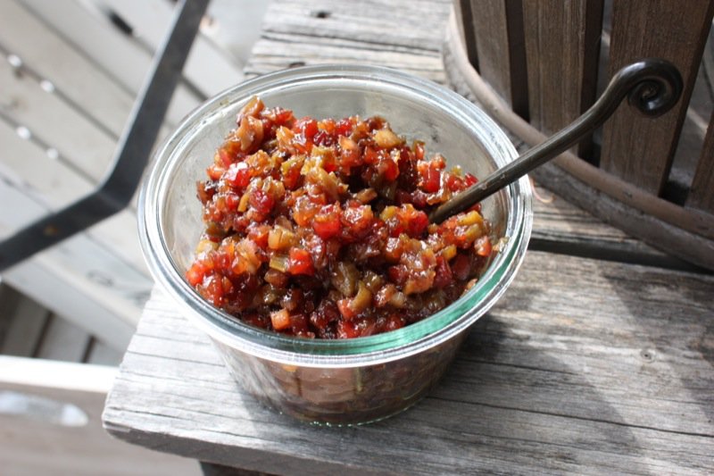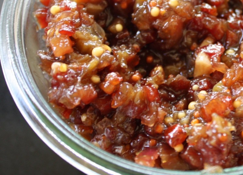 How does it taste? Bacon is the predominant flavour, as it should be. There is a strong scent of vinegar, but that doesn’t translate when tasting. The onion, garlic and rhubarb cannot be individually discerned. The concoction is sweet, tangy, and savoury. It has a bit of a bite as the texture isn’t smooth or crunchy. It is a bit chewy. I hate to confess. I could eat it by the spoonfuls. I think it will be the perfect partner to the French Artichoke Dip and Mini Cornbread Sticks I am serving it with at the party tonight. I’ll be sure to let you know!