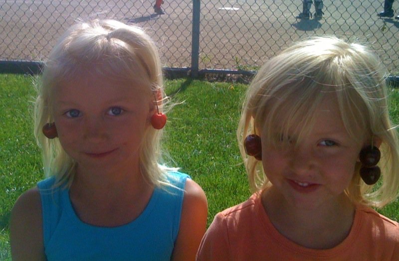 As I watched my nieces dive into a bag of fresh cherries, red juice dripping down on their t-shirts and on their cheeks, I was immediately taken back to my childhood. The unbridled pleasure of popping as many cherries as possible into your mouth in a row seems to be a sort of instinctual frenzy with the arrival of this magical fruit. As soon as the first cherries were ready (or in fact, still a little green) my brothers and I would each climb a tree (Vans were my favorite variety), claim a branch, perch, and rhythmically, like well-oiled machines, eat and spit pits until we were close to bursting. Like magic, the resulting stomachache every year would be forgotten when the next season arrived – and we would begin our annual custom all over again. Oh, and cherries make great earrings too.