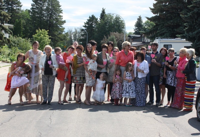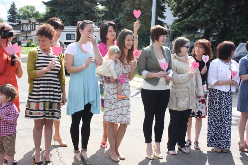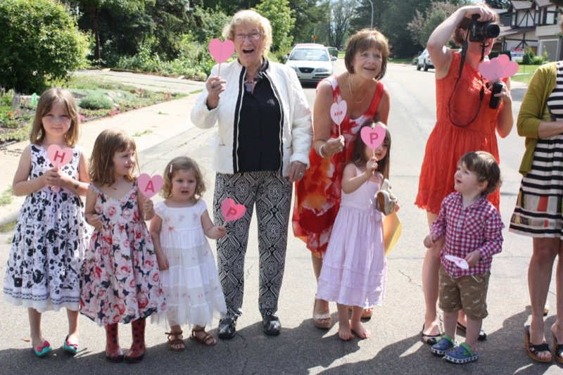All lined up in the middle of the street with pink heart shaped letters on a stick that aptly spelled: HAPPY BIRTHDAY! from one side to the other. Wiggling with excitement, we waited for her to turn the corner in the car.