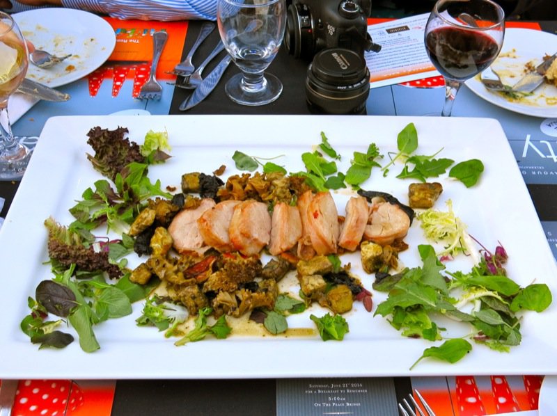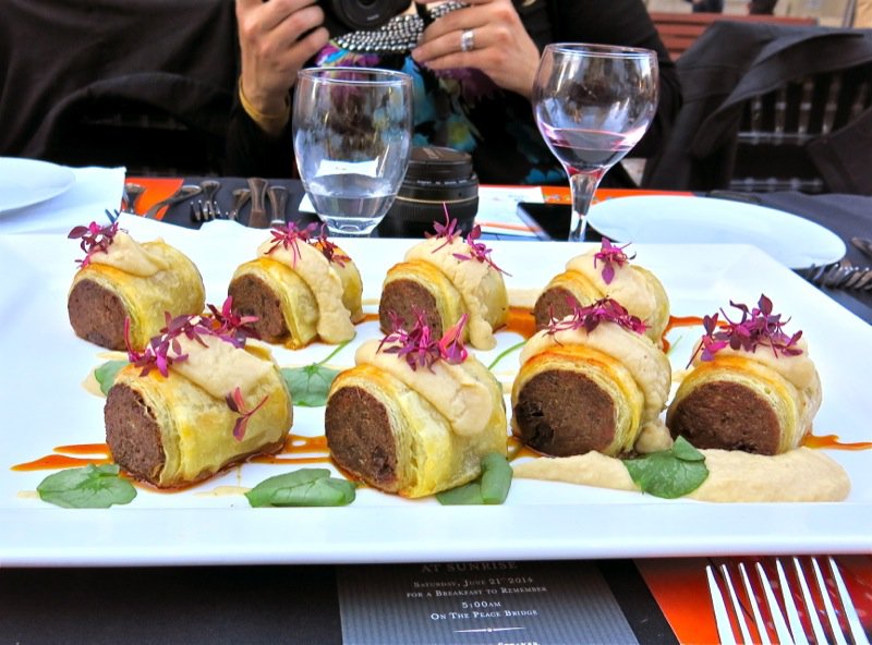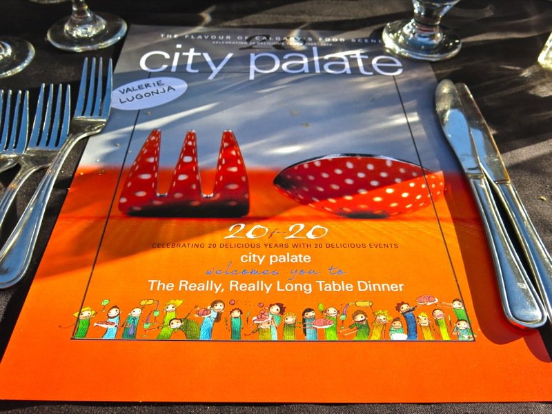 I attended on behalf of Alberta Culinary Tourism Alliance as I am one of the Directors. I would have been there, anyway. The profit from this $150 dollar a plate dinner went to the Red Cross Flood Relief Fund. My table partner, Karlynn from The Kitchen Magpie accompanied me to write about the event. Our team was seated at table one…. waaayyy down there by the white tent at the other end. The lucite chairs sparkled in the late afternoon sun. The black tablecloth with white linen napkins provided the perfect reserved and formal foil for the street party while cheery Gerber daisies grinned a welcome above the bright orange City Palate placemats. Sparkling rose in hand upon registration, we purposefully arrived in time to savour the setting.