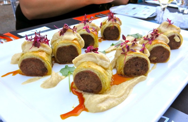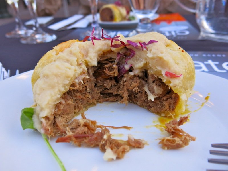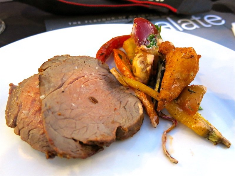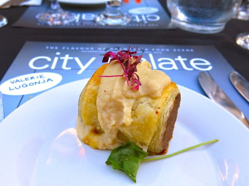 The third course was a little slow, we guessed, as the fourth one came in its place, tickety-boo: Elk Wellington with Foie Gras and Dried Cherries from Trib Steakhouse (Chef Ian Smith). The Parsnip Apple Purée was the perfect accompaniment and the splash of the somethin-somethin’ sticky sweet on the plate was platter lickin’ good, too.