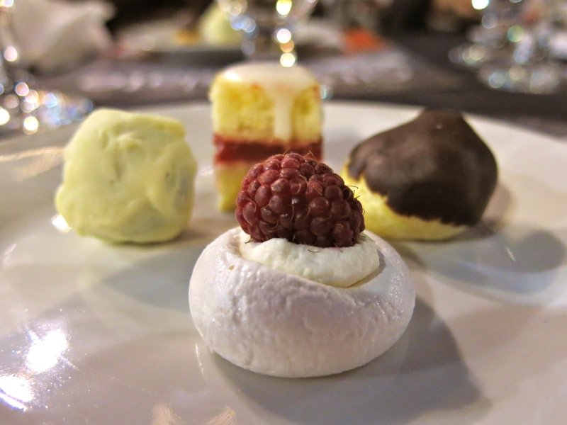 The Lemon Strawberry Chiffon Cake stole the show. It was moist and left everyone wanting. All too often restaurant cakes have little substance, but this one was light, yet dense and moist all at once, clearly made with love.The Mini Tiramisu was a misnomer, but I make a slammin’ Tiramisu, so I may be a harsh critic on that one. The Berry Pavlova was perfection: crisp, creamy, and sparkling with tart fruit. The Orange White Chocolate Truffle was a dense intense very sweet bite that punctuated the evening perfectly for me.