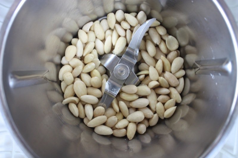 - Scale white skinned almonds into the TM bowl; mill for 10 seconds from 1-10 using the spatula to keep the mixture toward the blade; pulse as needed to get a fine texture; remove from TM bowl and set aside