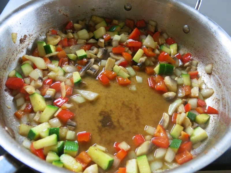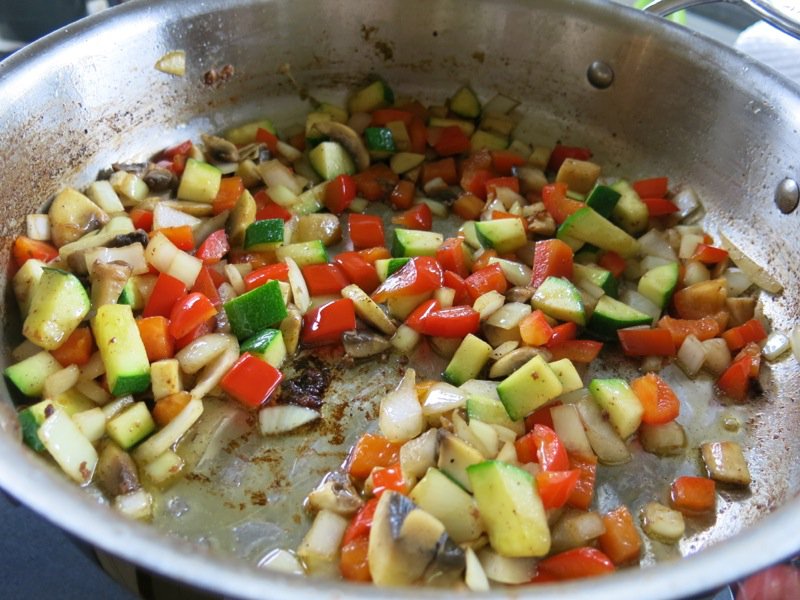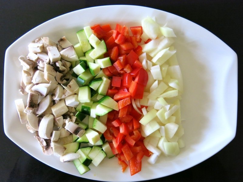 - 1/2 cup each diced zucchini , chopped onion, diced red pepper, diced button mushrooms