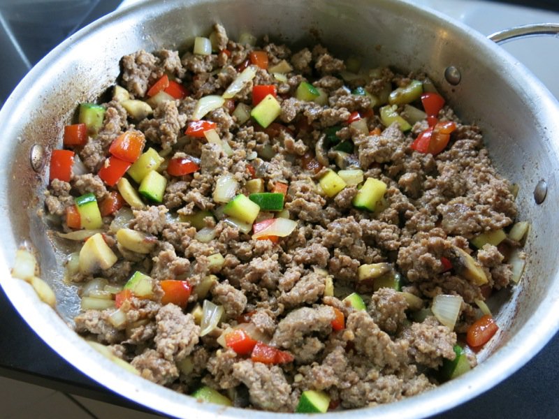 - Remove beef; in the same pan, sauté onions, mushrooms, zucchini, and red pepper over medium high heat in 1 teaspoon of extra virgin olive oil until the onions are soft and translucent and the mushrooms begin to release their water; season with 1/4 tsp each salt and pepper
