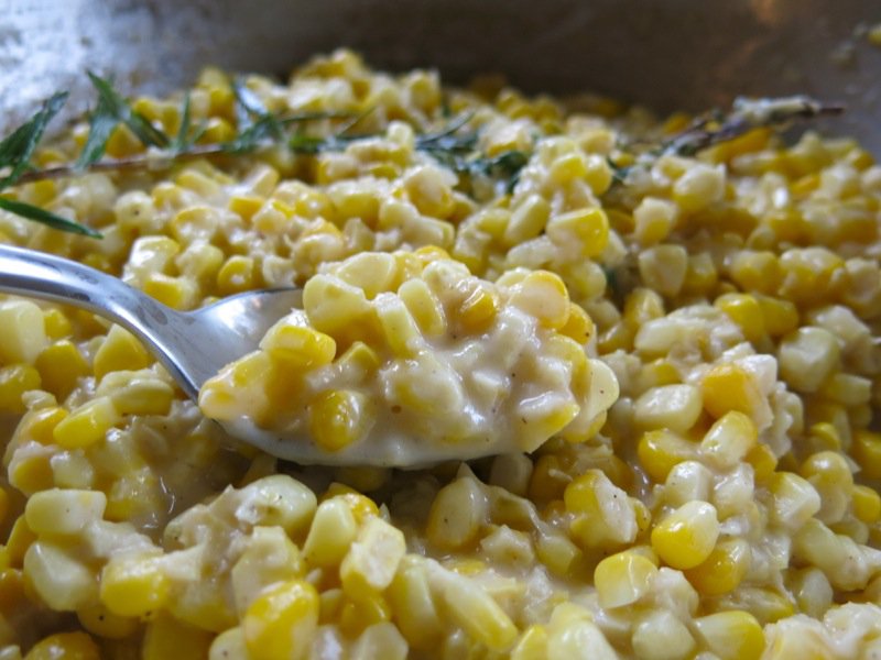 Fresh sweet corn stripped from the cobs and sautéed in butter with fresh thyme, then creamed.